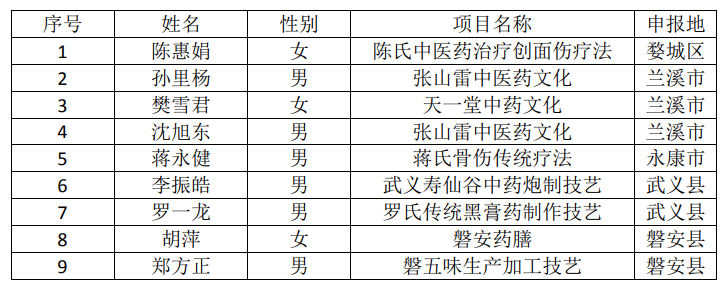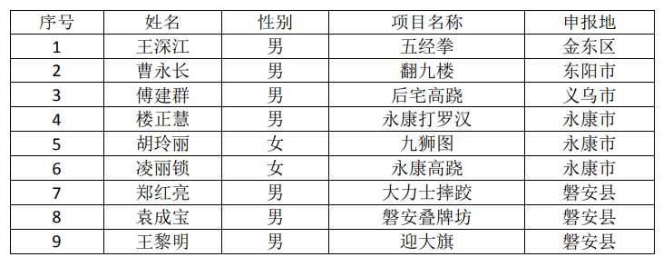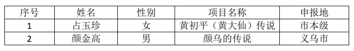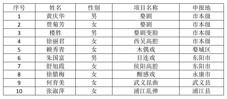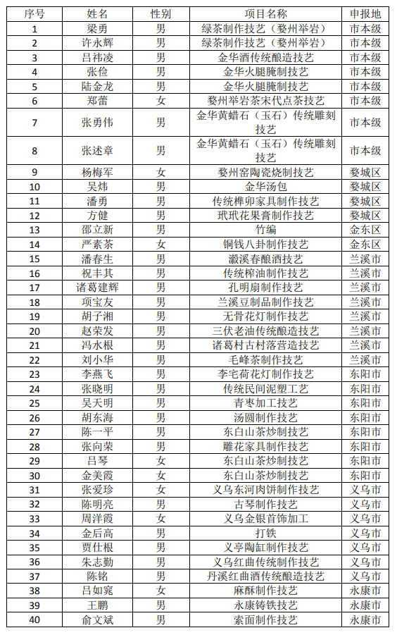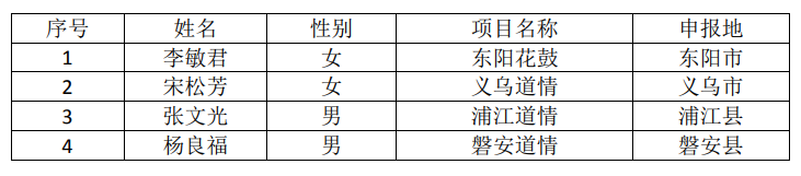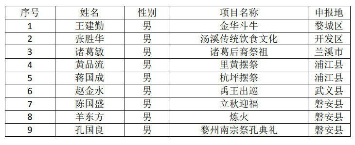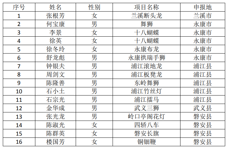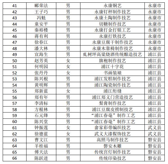 为加强金华市非物质文化遗产的保护传承,鼓励和支持非物质文化遗产代表性传承人开展传习活动,根据《中华人民共和国非物质文化遗产法》《浙江省非物质文化遗产保护条例》《金华市非物质文化遗产项目代表性传承人认定与管理暂行办法》等文件精神,金华市文化广电旅游局于 2023 年 7 月下发了《关于开展第六批市级非物质文化遗产代表性传承人推荐工作的通知》。经各地推荐,金华市文化广电旅游局组织专家评审会评议和公示,确定占玉珍等 145 名传承人为第六批金华市非物质文化遗产代表性传承人,现予以公布。